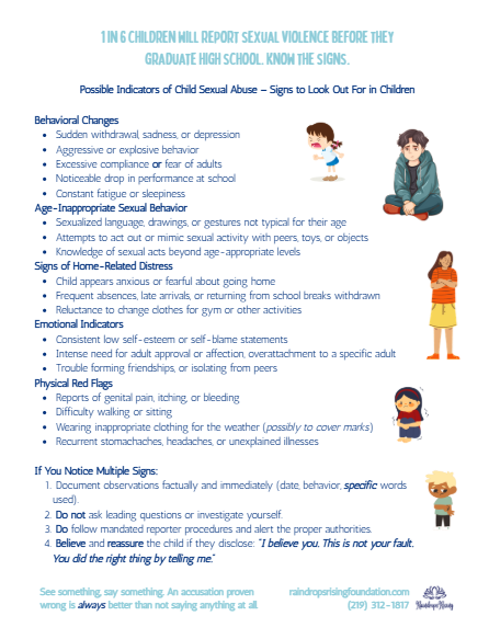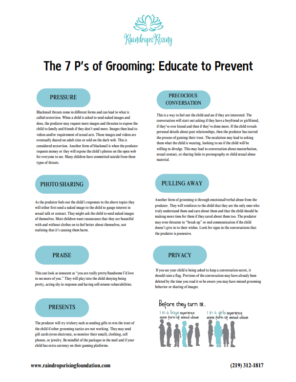 Resources for Children Body Safety Rules Possible Indicators of Child Sexual Abuse The 7 P’s of Grooming Consent (The Kids Version!) Child Body Safety Diagram